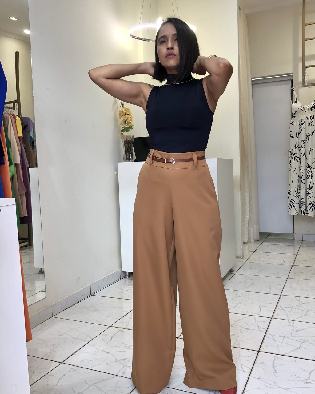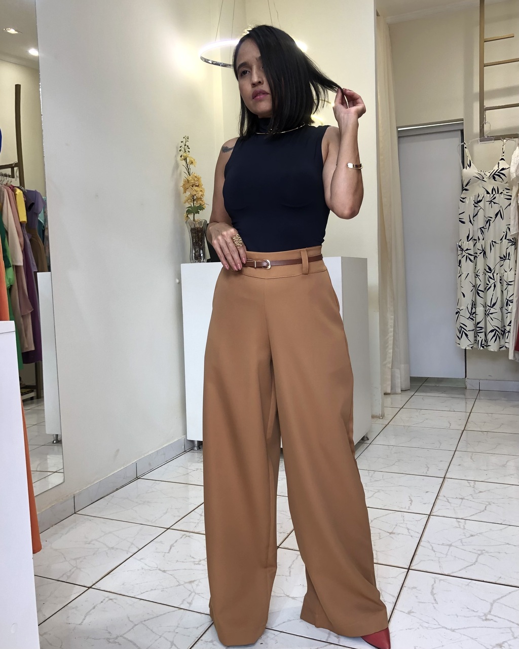 Modelagem colada fica ótima com peças mais soltas: pantalona, calça alfaiataria, pantacourt e etc. Também fica perfeita com tênis e com jeans. Versatilidade a define, você consegue combinar com praticamente tudo.